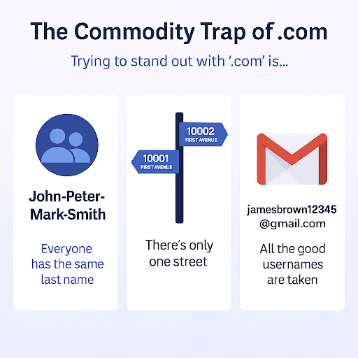 That’s exactly the situation with .com. Overcrowding forces businesses into convoluted names, while the extension—always the same—is wasted space.
