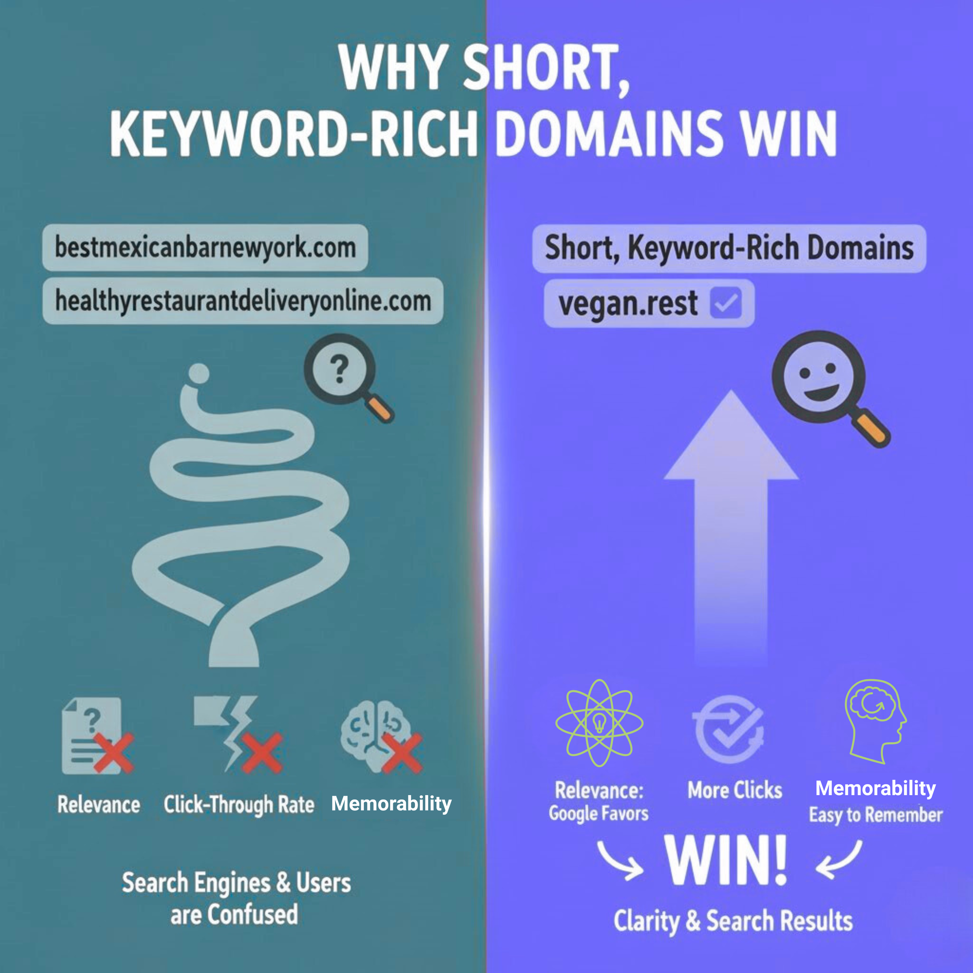 When your domain includes a clear keyword like “mezcal.bar” or “vegan.rest,” search engines and users instantly understand what you’re about.